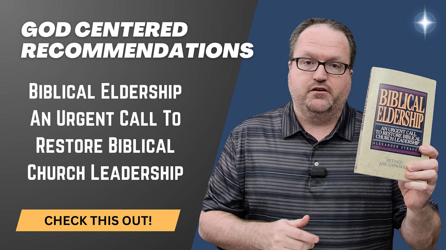Playback speed×Share postShare post at current timeShare from 0:000:00/0:00Transcript11Biblical Eldership By Alexandre Strauch - God Centered RecommendationsFor 35 years Biblical Eldership has been the premier book explaining the biblical teaching on church eldership.Andy CainMar 05, 202611ShareTranscriptPurchase On Amazon - https://www.amazon.com/Biblical-Eldership-Restoring-Rightful-Church/dp/0936083808Biblical Eldership Website - https://www.biblicaleldership.com/SubscribeDiscussion about this videoCommentsRestacksGod Centered RecommendationsThese are the various recommendations that we make here at God Centered Theology. Everything from books to websites to media channels, and more!These are the various recommendations that we make here at God Centered Theology. Everything from books to websites to media channels, and more!SubscribeAuthorsAndy CainRecent PostsThe King James Only Controversy By Dr. James R. White - God Centered RecommendationsMar 2 • Andy CainLegacy Standard Bible Scripture Notebooks - God Centered RecommendationsFeb 21 • Andy CainGod Centered Recommendations - Legacy Standard BibleFeb 17 • Andy Cain